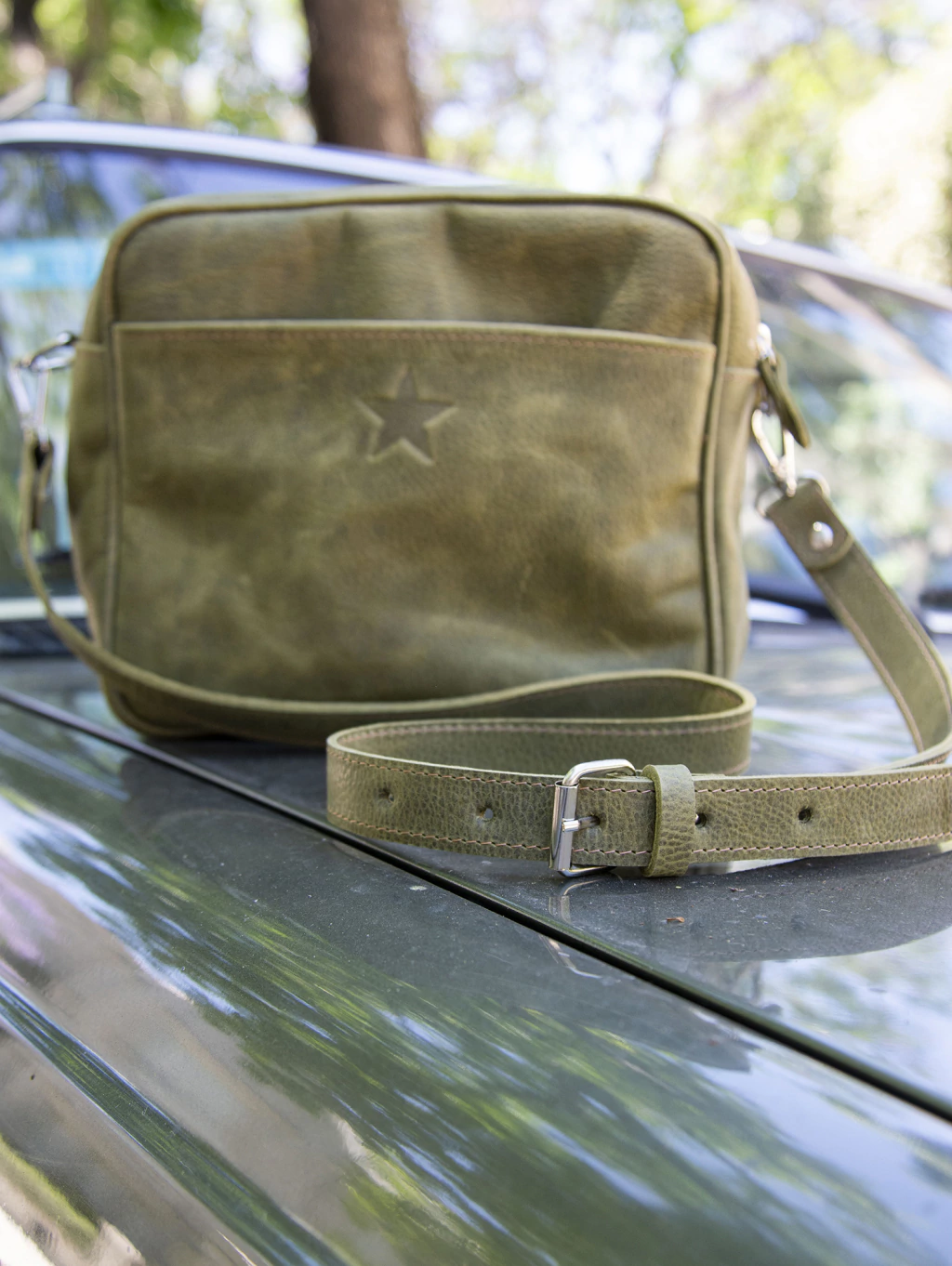 DESCRIPCIÓN: Cartera 100%CUERO. Bandolera y colgar. Manijas desmontables de cuero. Cierra con cierre de metaL IKK. Trae doble cierre y compartimento. En el frente tiene un bolsillo grabado con estrella. Interior: bolsillo con cierre, bolsillo porta celular y mosquetón para las llaves. Forrada con gross con apresto. Herrajes níquel.