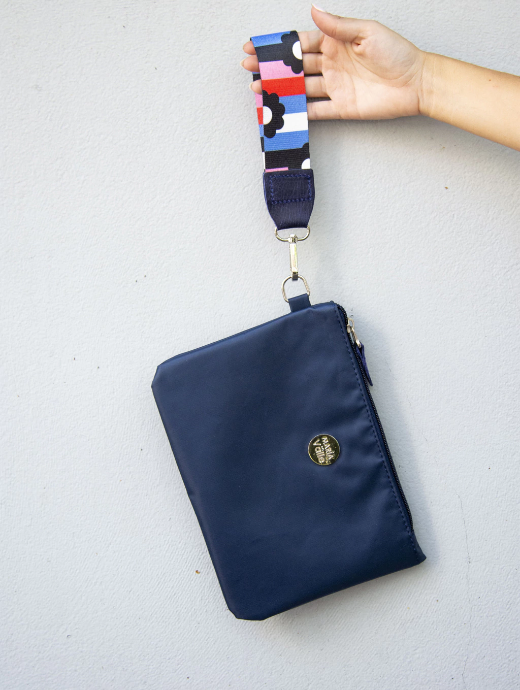 Descripción: Sobre de tela textil con soporte. Forrado con gros con apresto. Tiene un bolsillo interno. Trae un gancho externo con un llavero de cinta de punta de cuero. Herrajes niquel. Cierra con cierre de metal. Logo chapa redonda MARIA DEL VALLE. Medidas: 27 cm ancho x 18 cm alto.